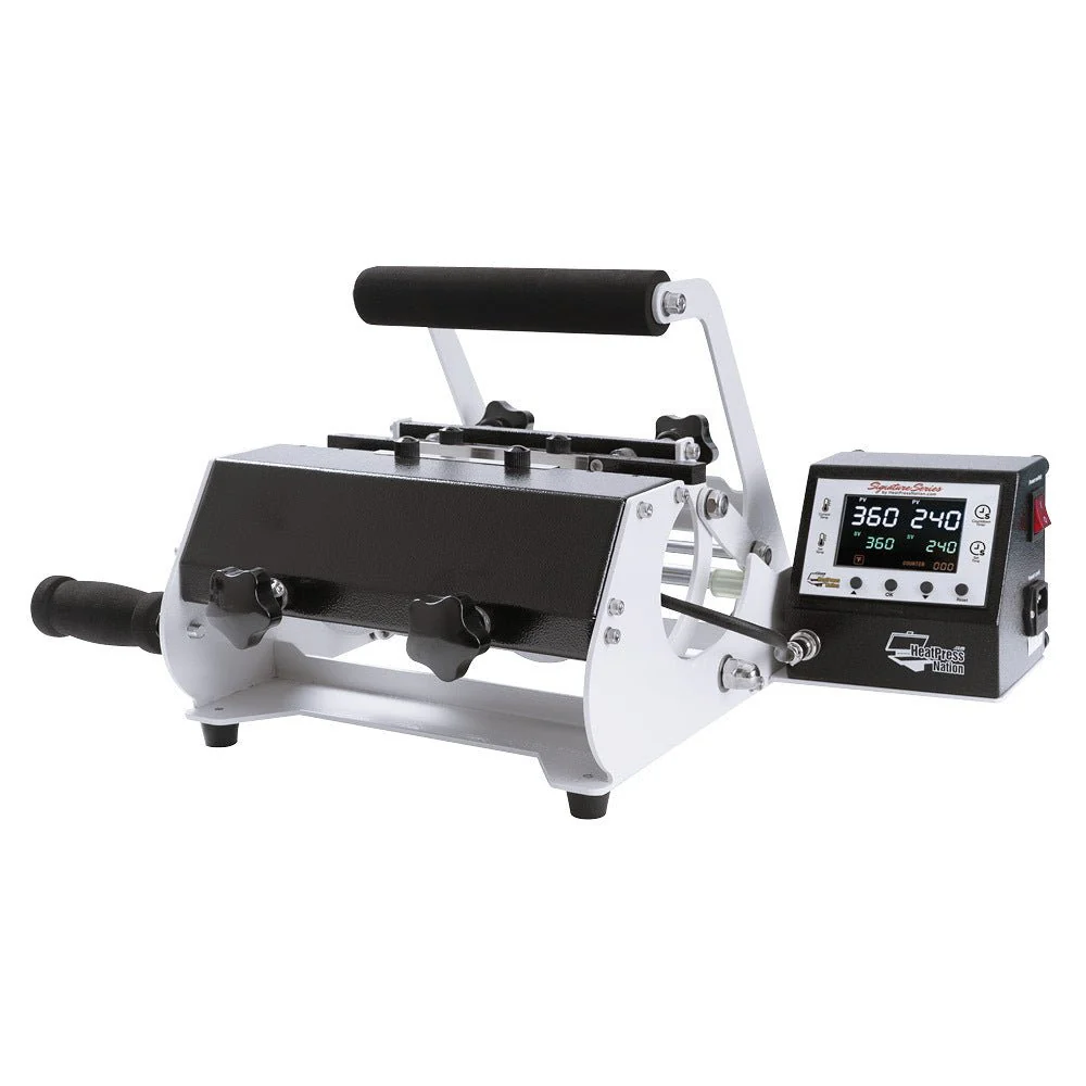 The HPN Signature Series Mug Heat Press machine is designed to easily and efficiently heat transfer custom images onto standard mugs and water bottles. From small-sized graphics such as names and logos to full bleed, top-to-bottom images, the HPN Signature Series Mug Cup Heat Press delivers exceptionally high-quality sublimation transfers every time. The thick, solid steel framework offers durability for full production use in any home or entrepreneurial environment while the state-of-the-art digital computer gauge accurately displays and regulates time and temperature.