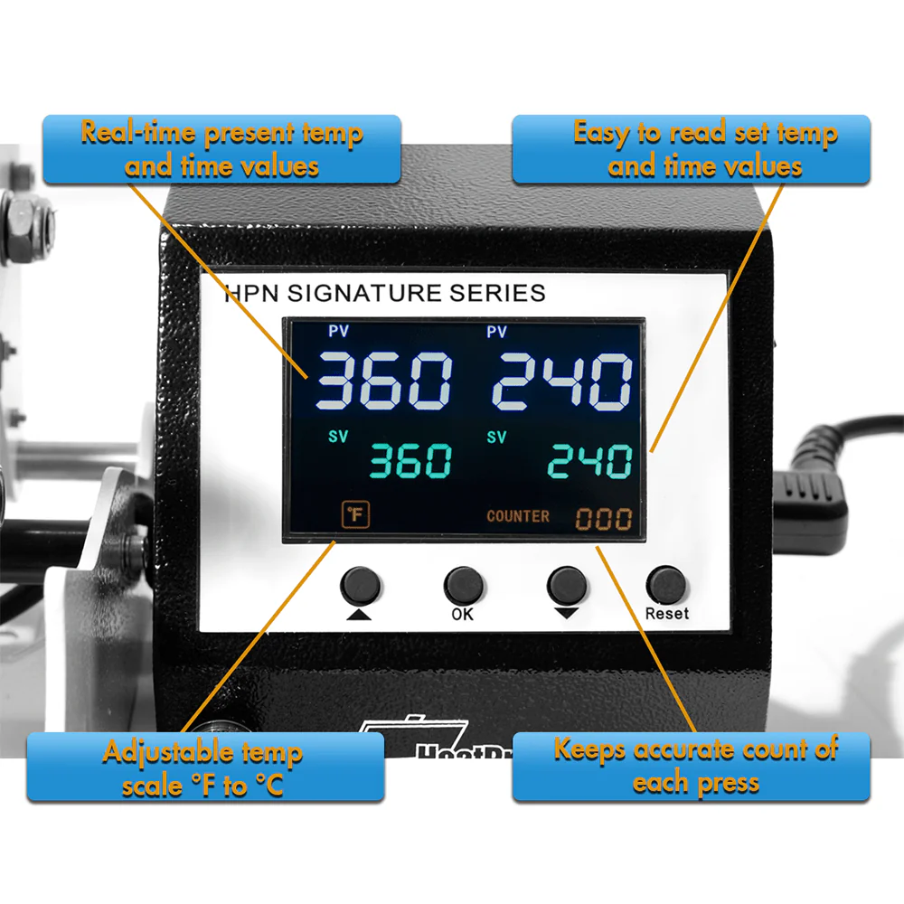 - The automatic timer and alarm indicate the completion of the heat press cycle